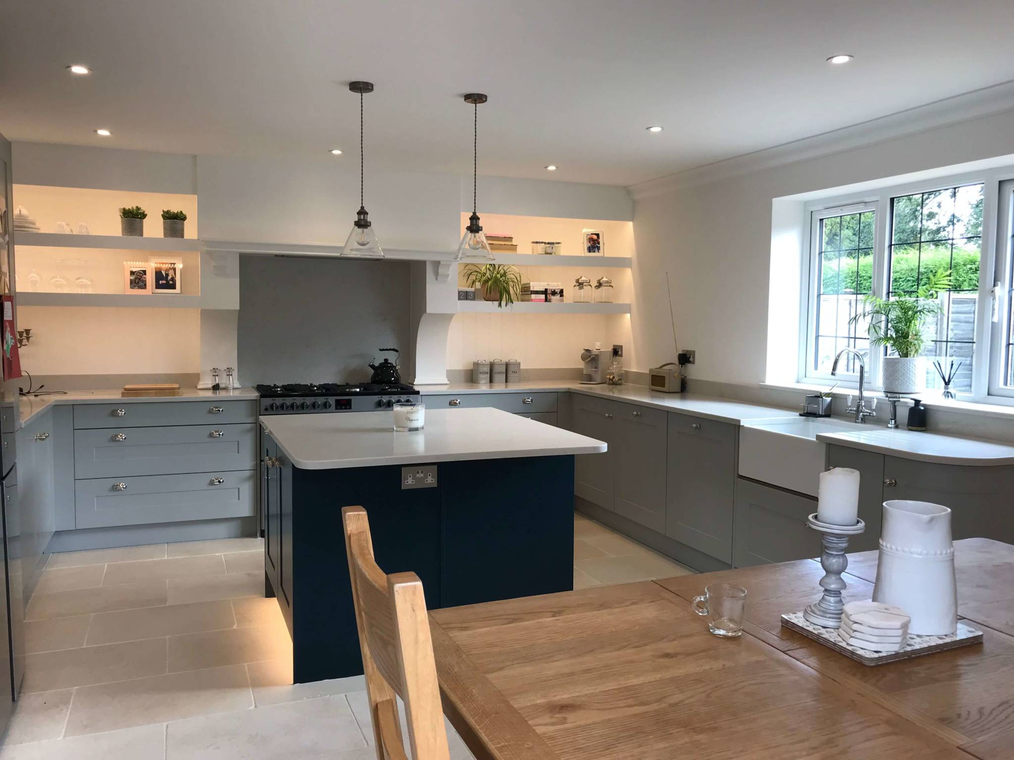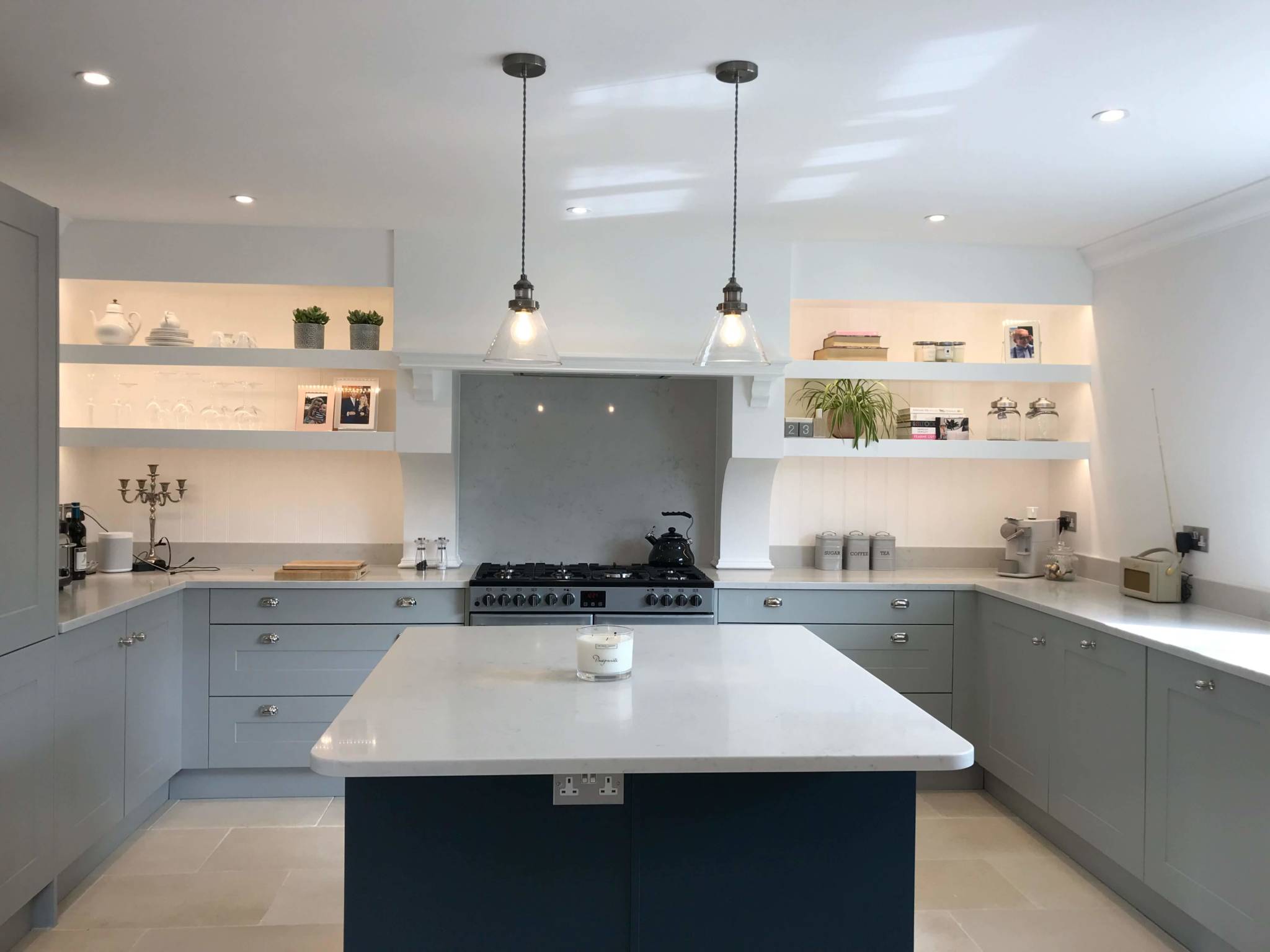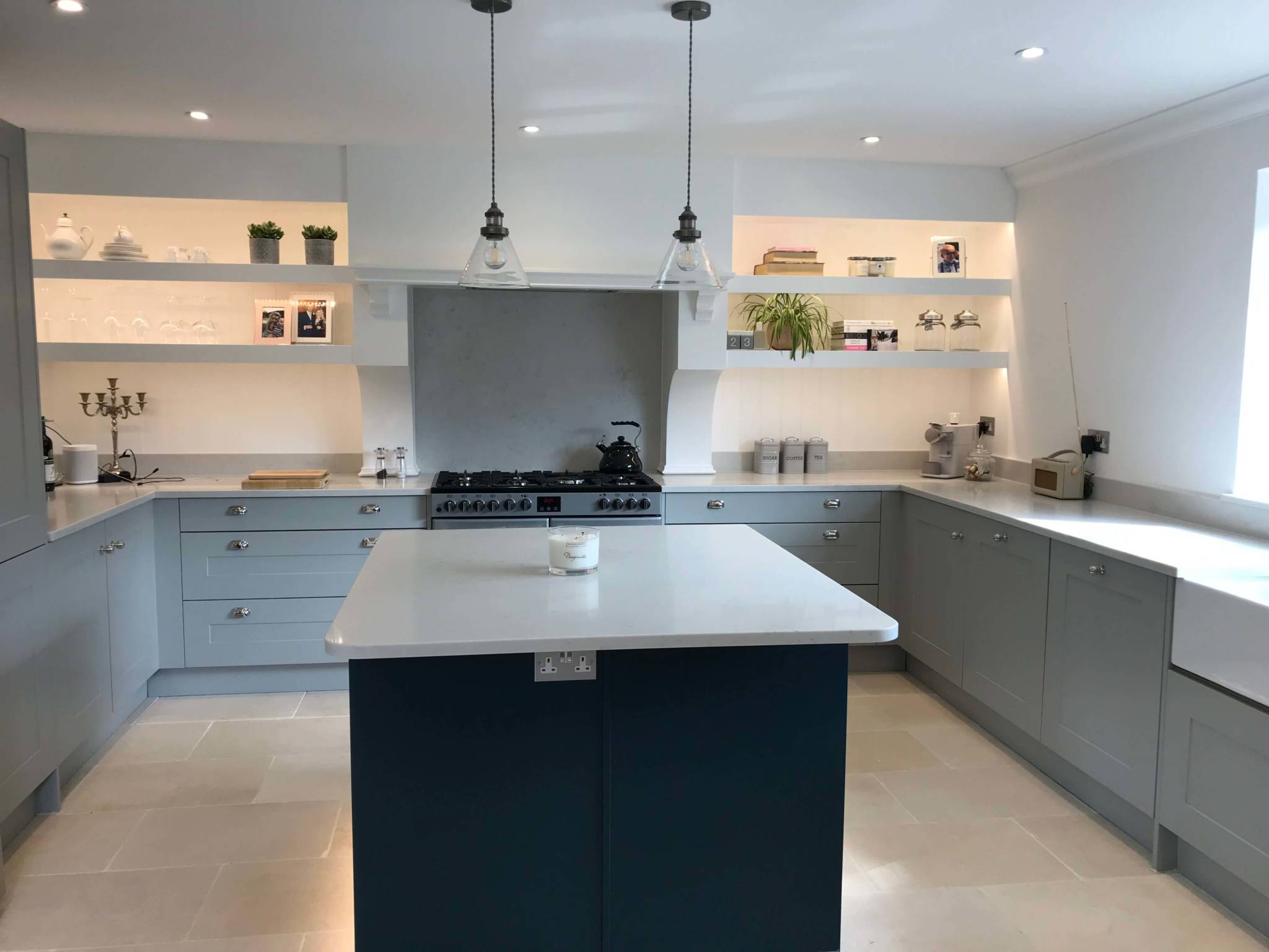A stunning modern and contemporary take on a country kitchen with two tone doors and a combination of handles. The kitchen boasts an elegant marble worktop and splash back. The bespoke made mantle and shelving along with the great lighting touches bring this kitchen alive with timeless style. The flooring we laid throughout gives the property a light and airy feeling.