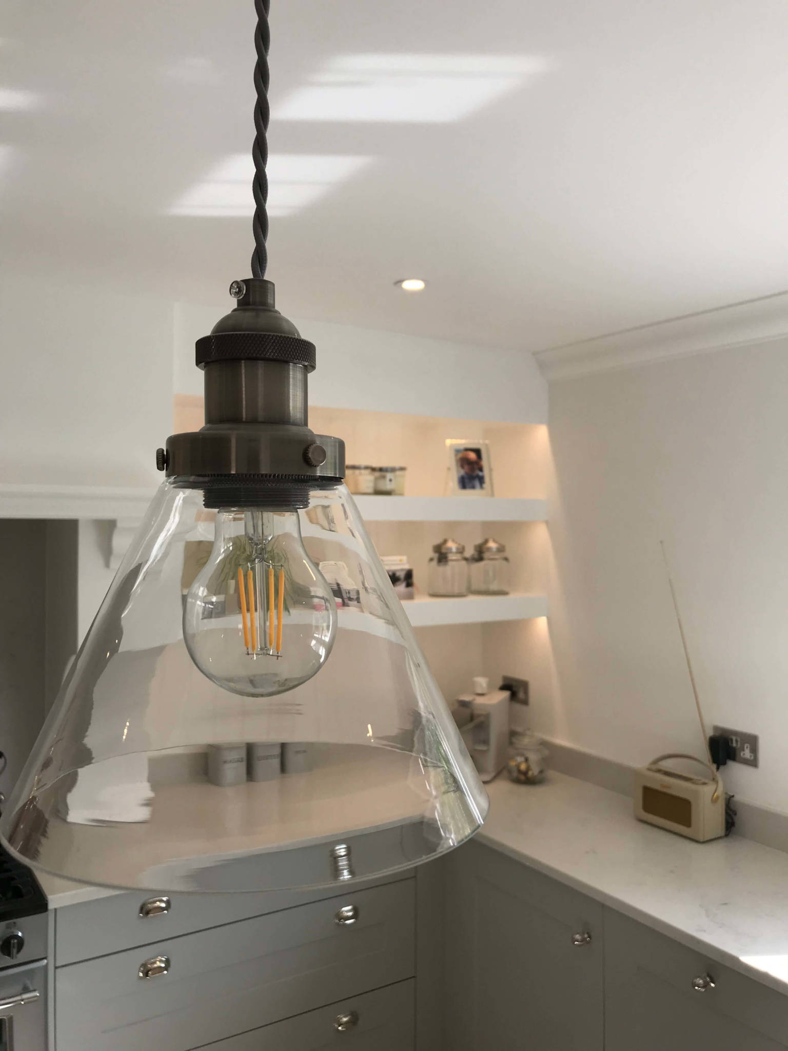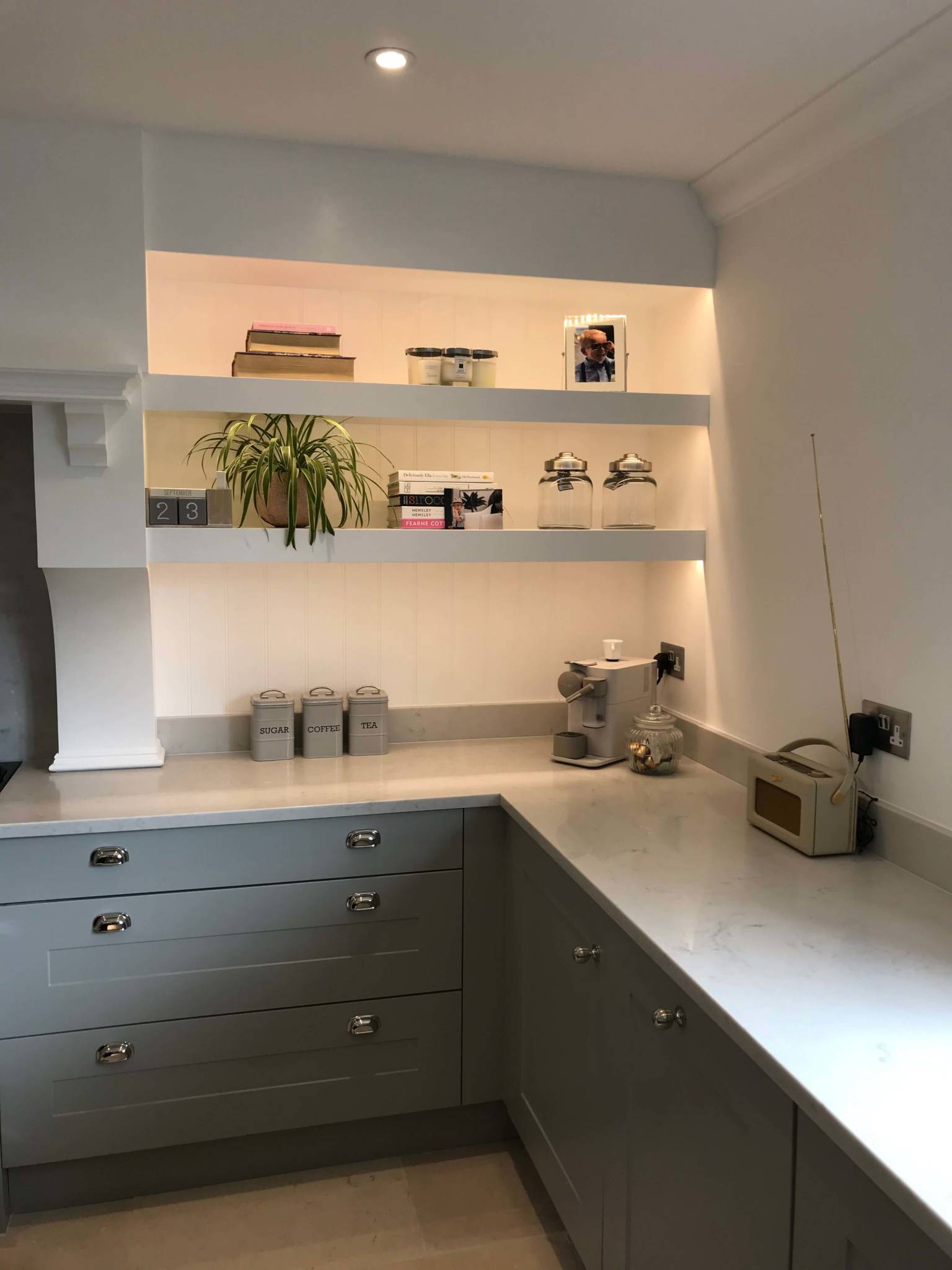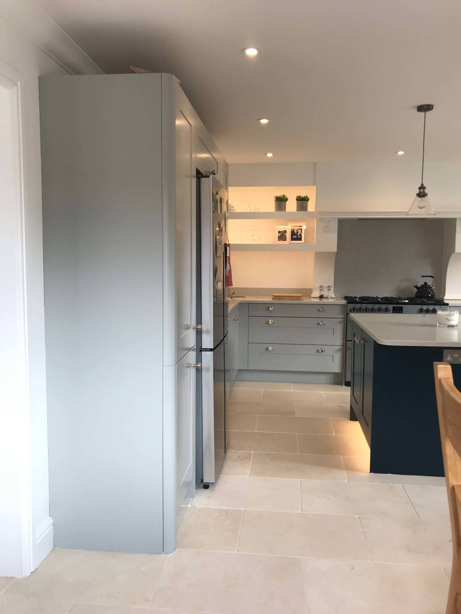 A stunning modern and contemporary take on a country kitchen with two tone doors and a combination of handles. The kitchen boasts an elegant marble worktop and splash back. The bespoke made mantle and shelving along with the great lighting touches bring this kitchen alive with timeless style. The flooring we laid throughout gives the property a light and airy feeling.