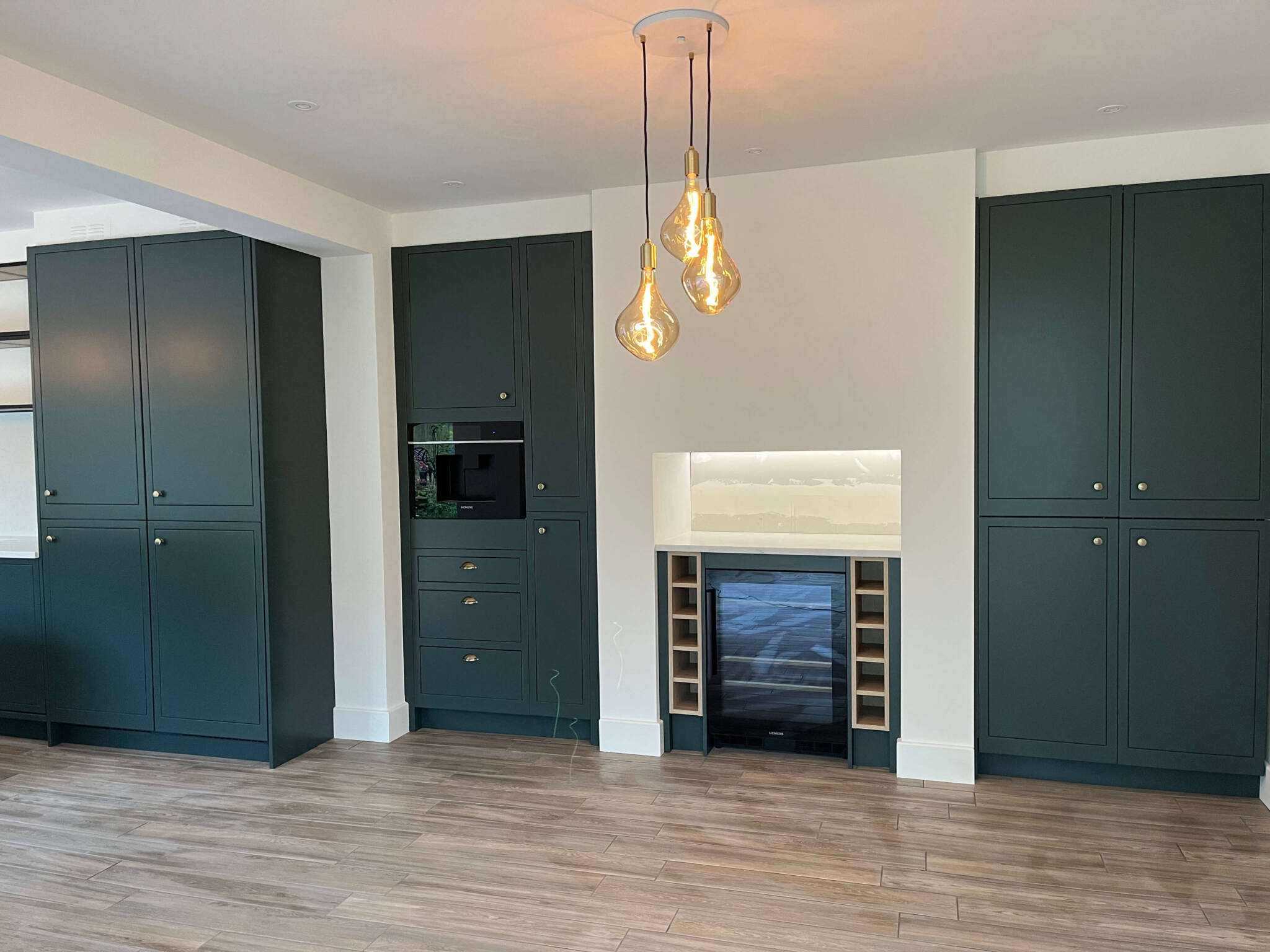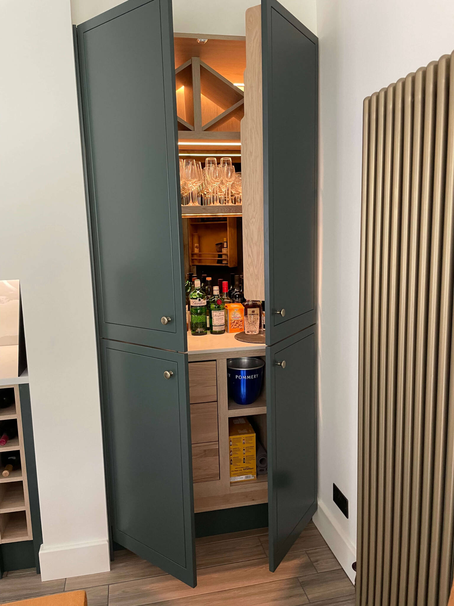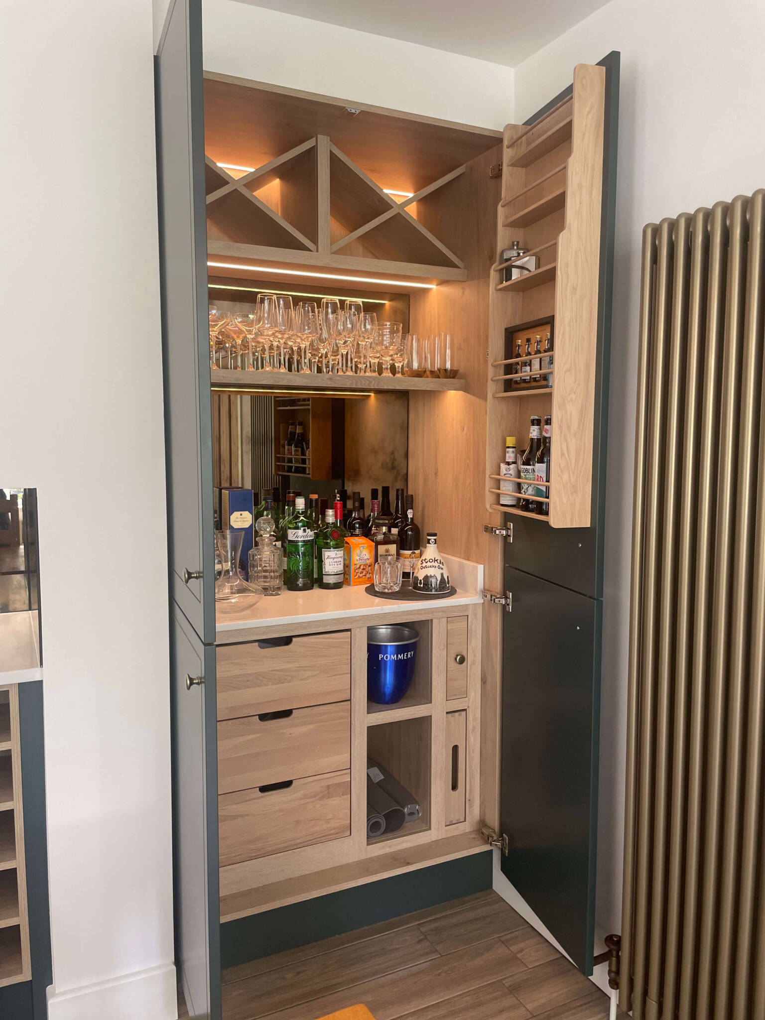 Incorporating touches of luxury, we designed a bespoke gin drinks cabinet to fit perfectly within the existing room. This elegant feature adds a sophisticated flair to the kitchen. Additionally, a wine lover corner was created, complete with a wine cooler, built-in marble worktops, and antique mirrors. These elements combine to offer a refined and stylish space.