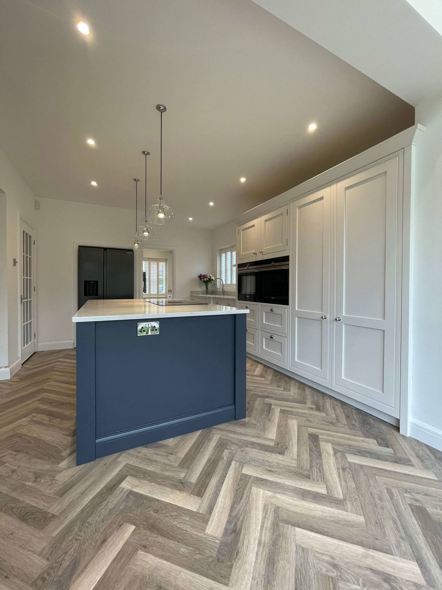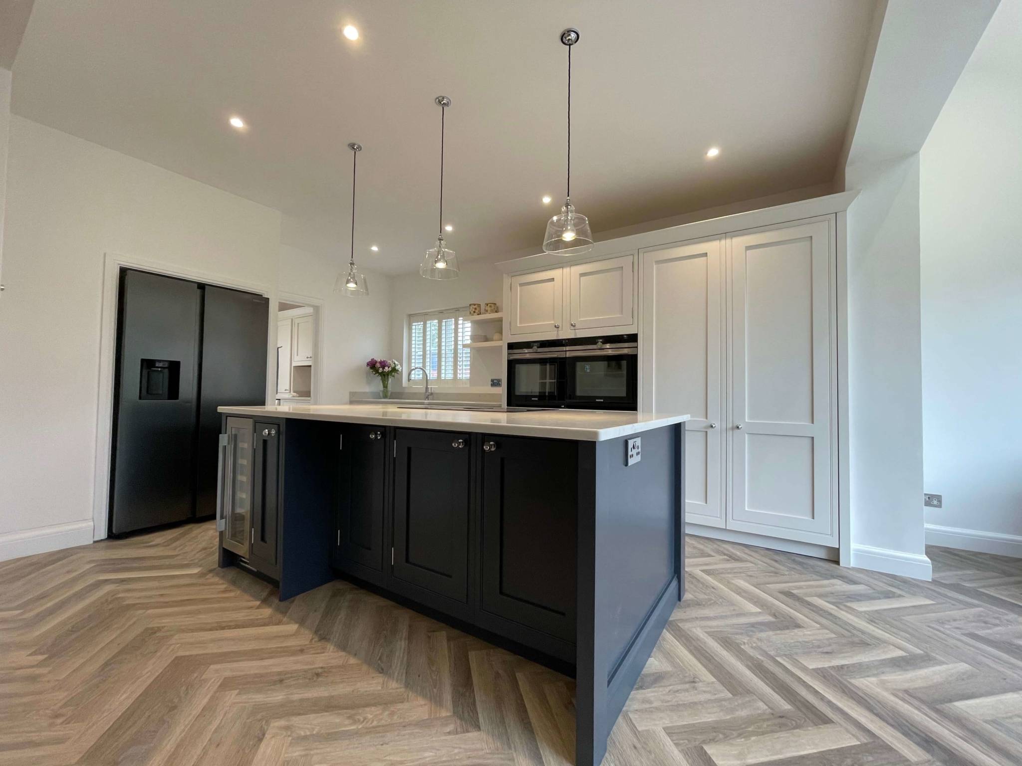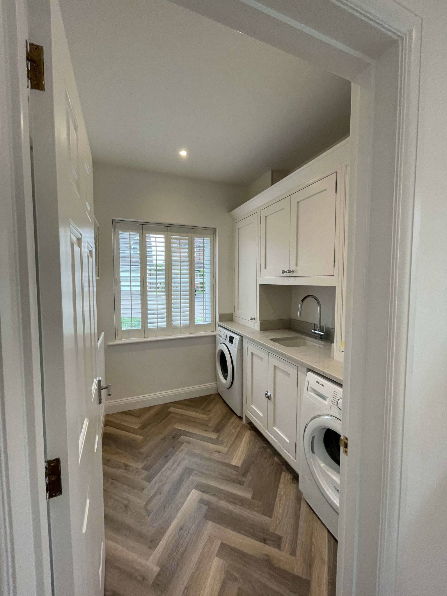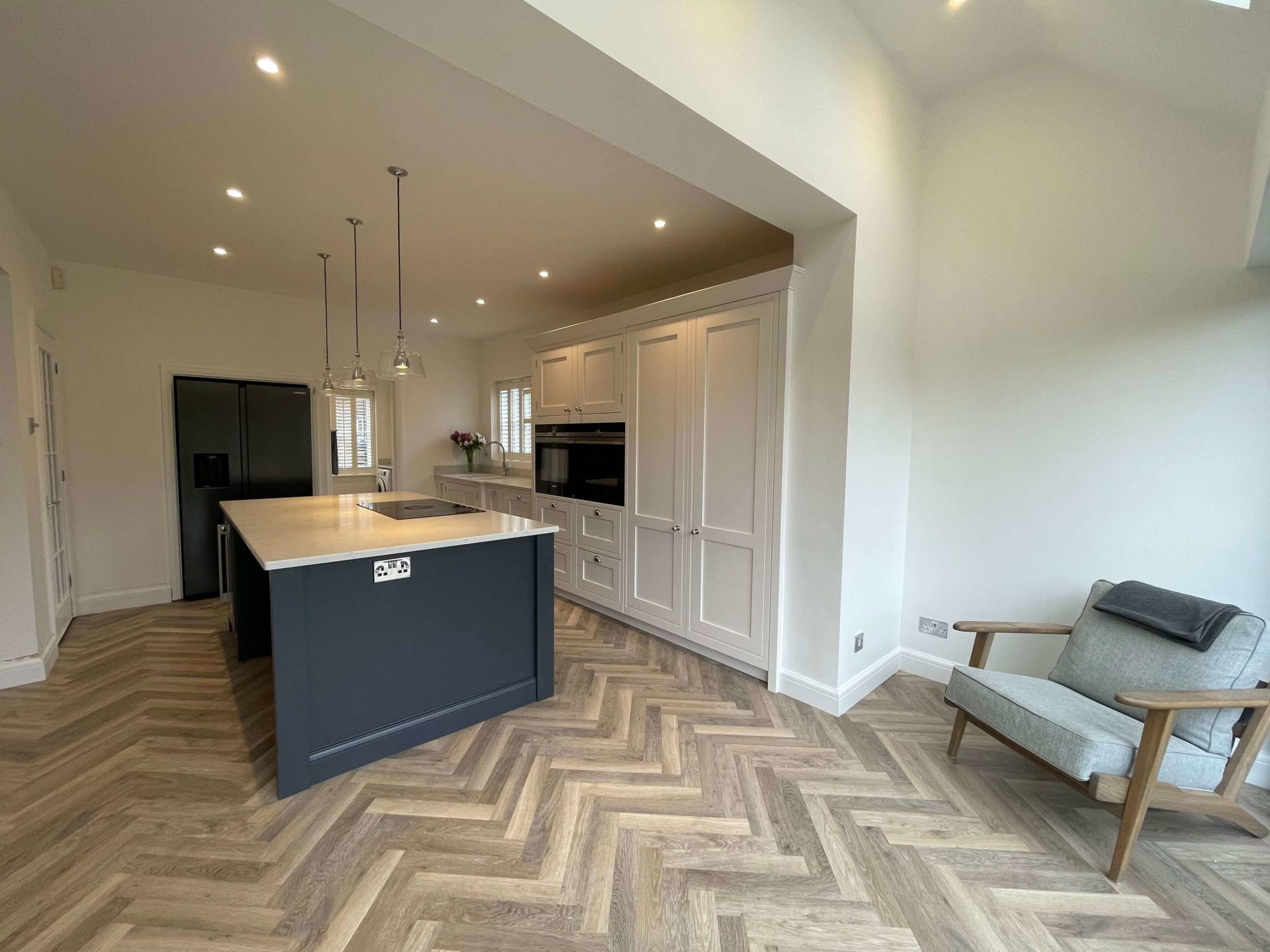The overall ascetics of this kitchen and utility room combines wall panelling, moulded cornice, and a herringbone timber floor with a beautiful contrasting pallet.