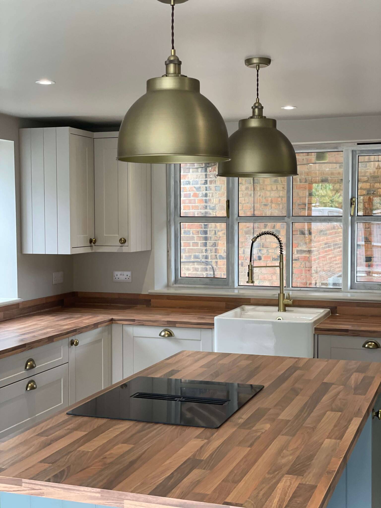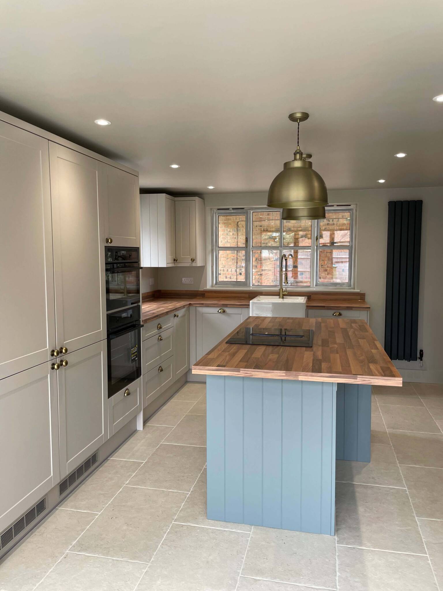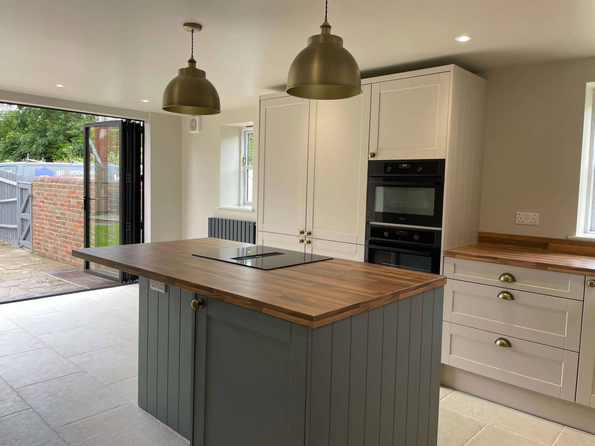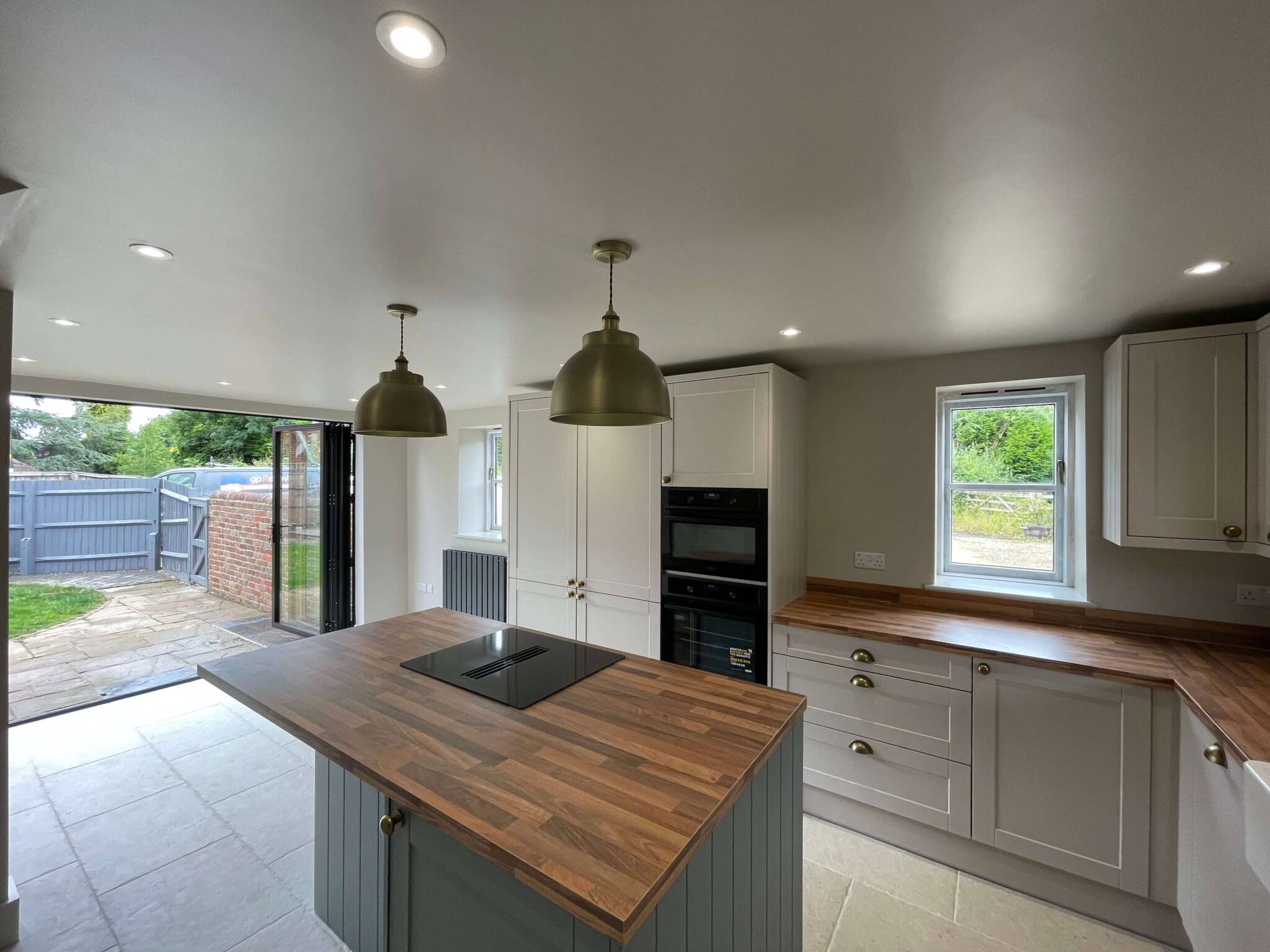 Incorporation of a traditional shaker kitchen, harmonising with the barn’s rustic charm while providing a modern touch in elegant hews.