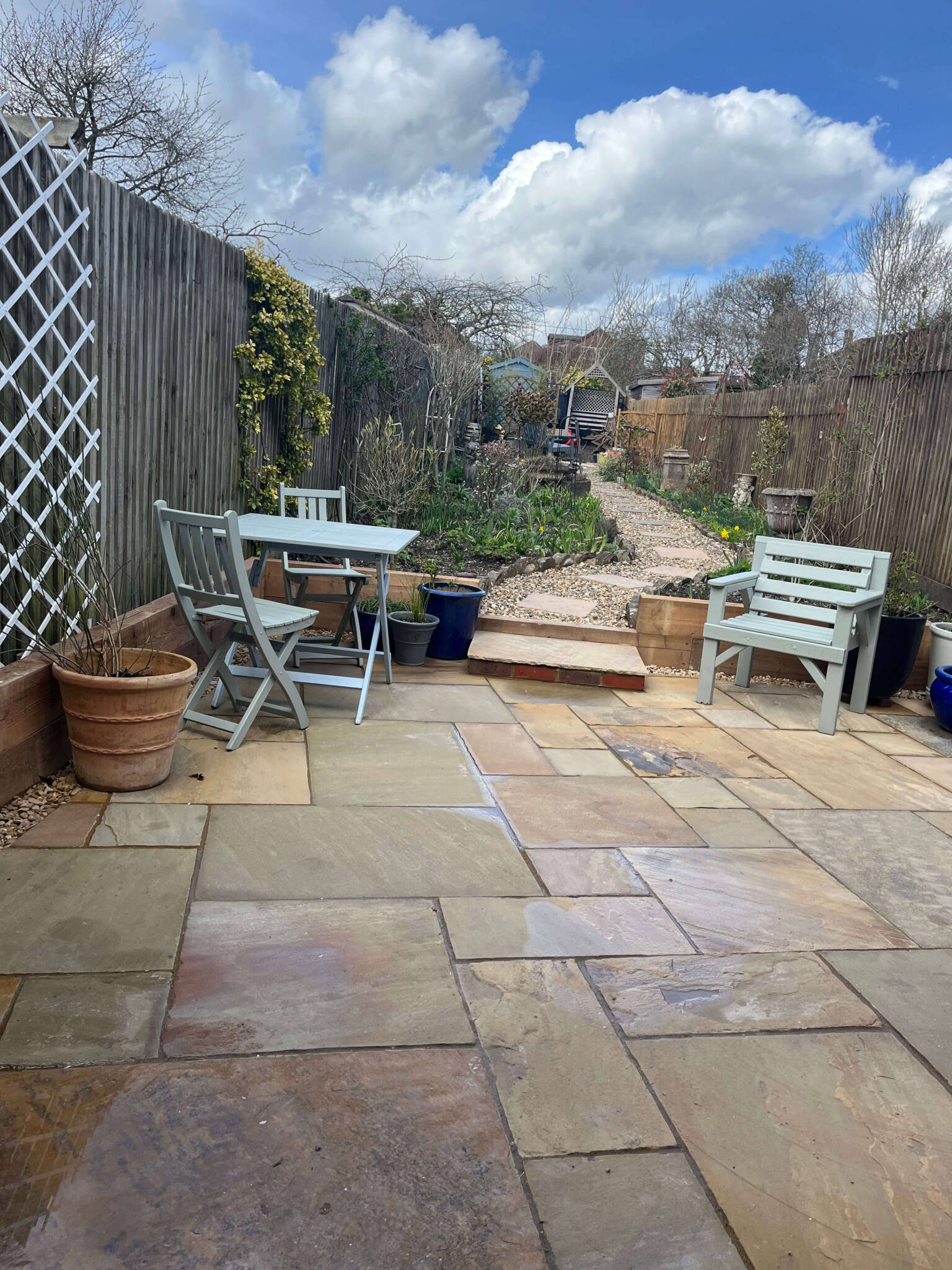 The extension opens through elegant French doors onto an enchantingly landscaped garden. This outdoor space serves as a tranquil haven for relaxation and social activities, while also enhancing the property’s security.